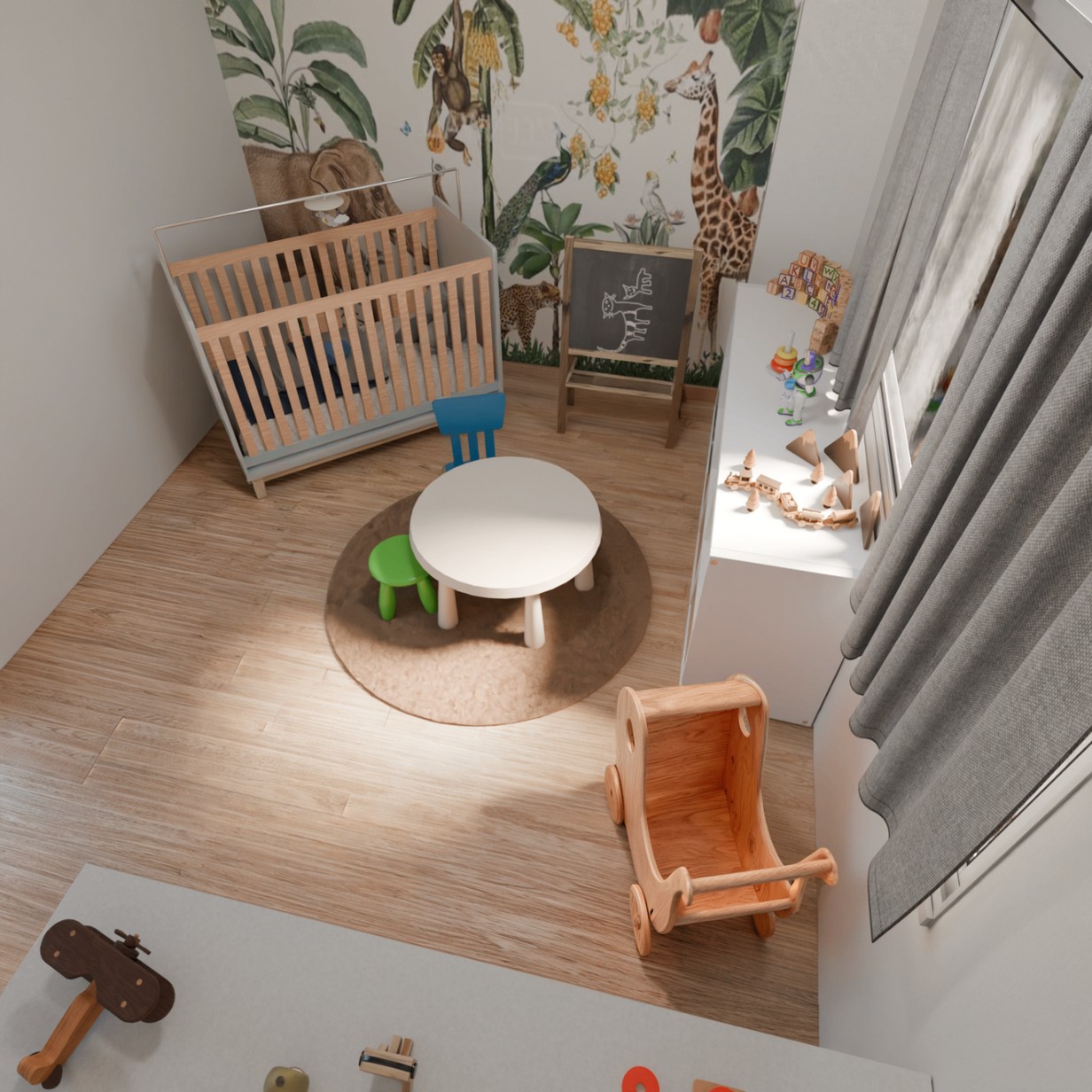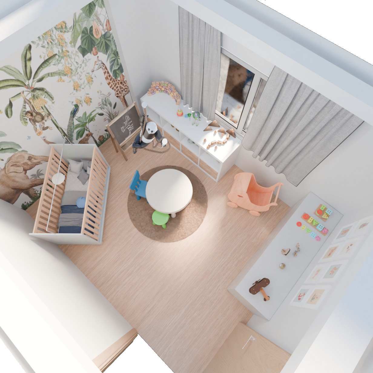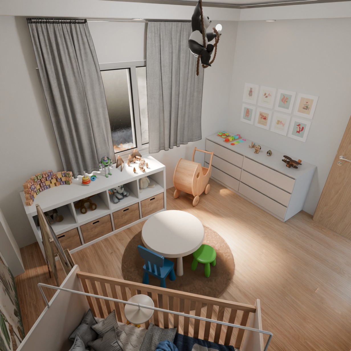 Dans notre conception 3D de cette chambre pour bébé, chaque élément a été pensé pour offrir un espace à la fois doux, fonctionnel et adapté aux besoins des parents et de l’enfant. Le lit bébé, placé près d’un mur décoré avec un papier peint aux motifs délicats et apaisants, devient le cœur de la pièce.